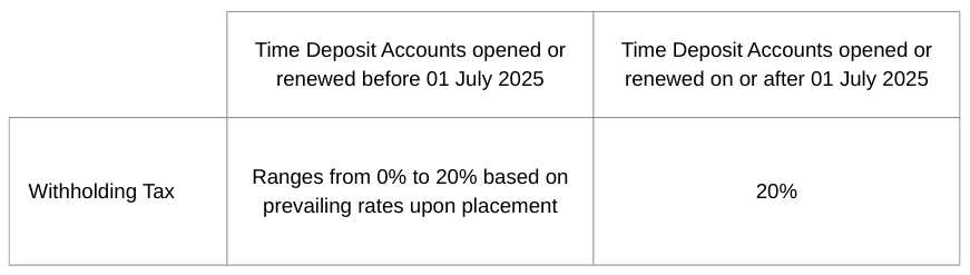 Republic Act 12214 was signed into law on the 29th of May 2025 which, among other provisions, repeals the exemption of long-term time deposit from withholding tax.