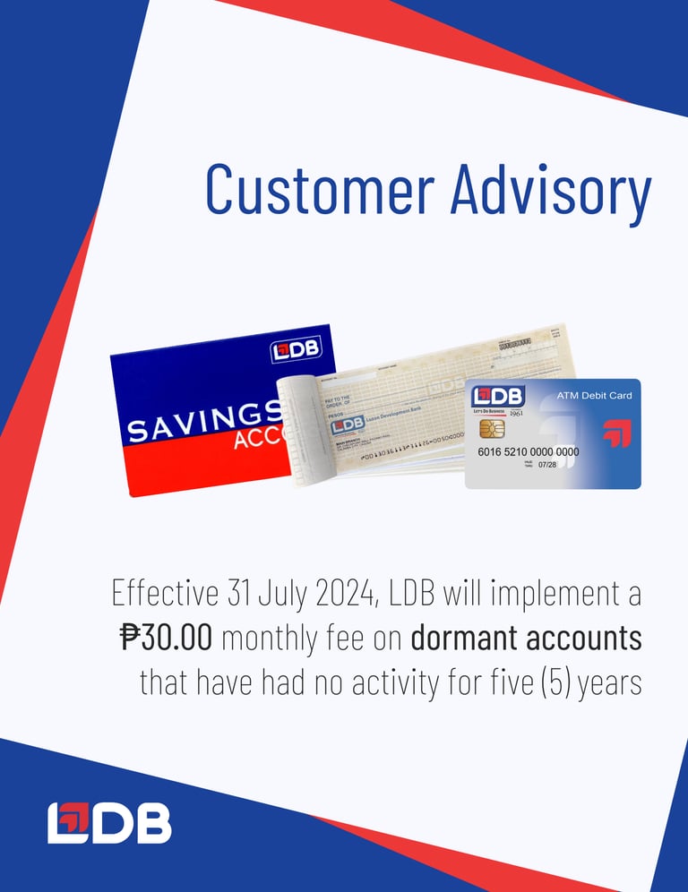 Starting on the 31st of July 2024, all dormant deposit accounts (except Time Deposit) that do not have any activity for at least five (5) years will incur a thirty-peso (₱30.00) monthly dormancy fee.