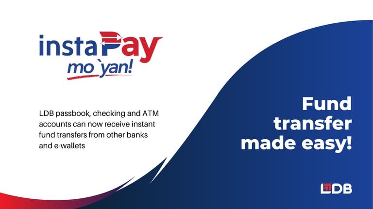 Instapay is the fastest way to transfer money from a different bank or e-wallet to your LDB deposit account. This facility is available 24/7 all-year round and the transferred amount gets credited instantly to your account.